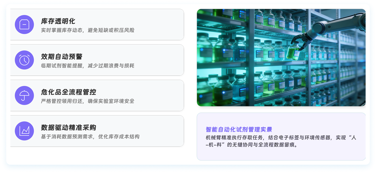 实现试剂、耗材、危化品及标准物质的全流程出入库管理与实时库存监控,打造实验室精益化管理闭环。