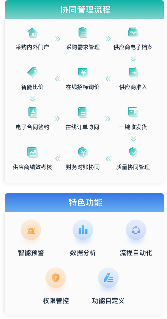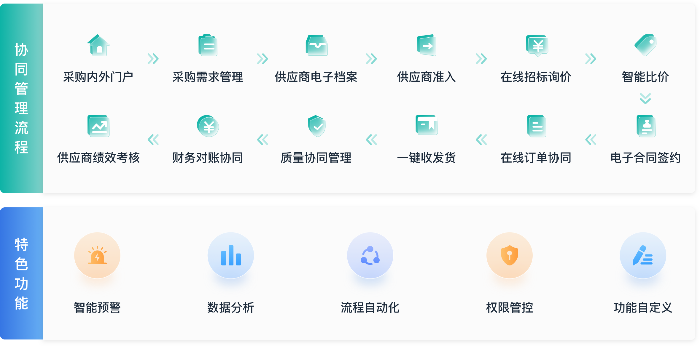 对内,帮助企业搭建采购需求管理中心;对外,企业可跨平台、跨组织地与供应商开展在线业务协作