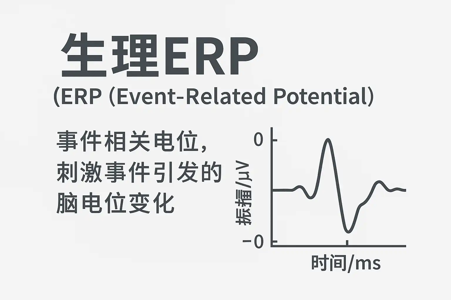 生理ERP,全称为“事件相关电位”(Event-Related Potential),是指在感官刺激或认知任务过程中,大脑皮层神经元群体活动所产生的微弱电信号,这些信号能够通过头皮上的EEG(脑电图)仪器检测到,并通过特定的方法进行叠加和平均,以突出与特定事件相关的大脑反应成分。