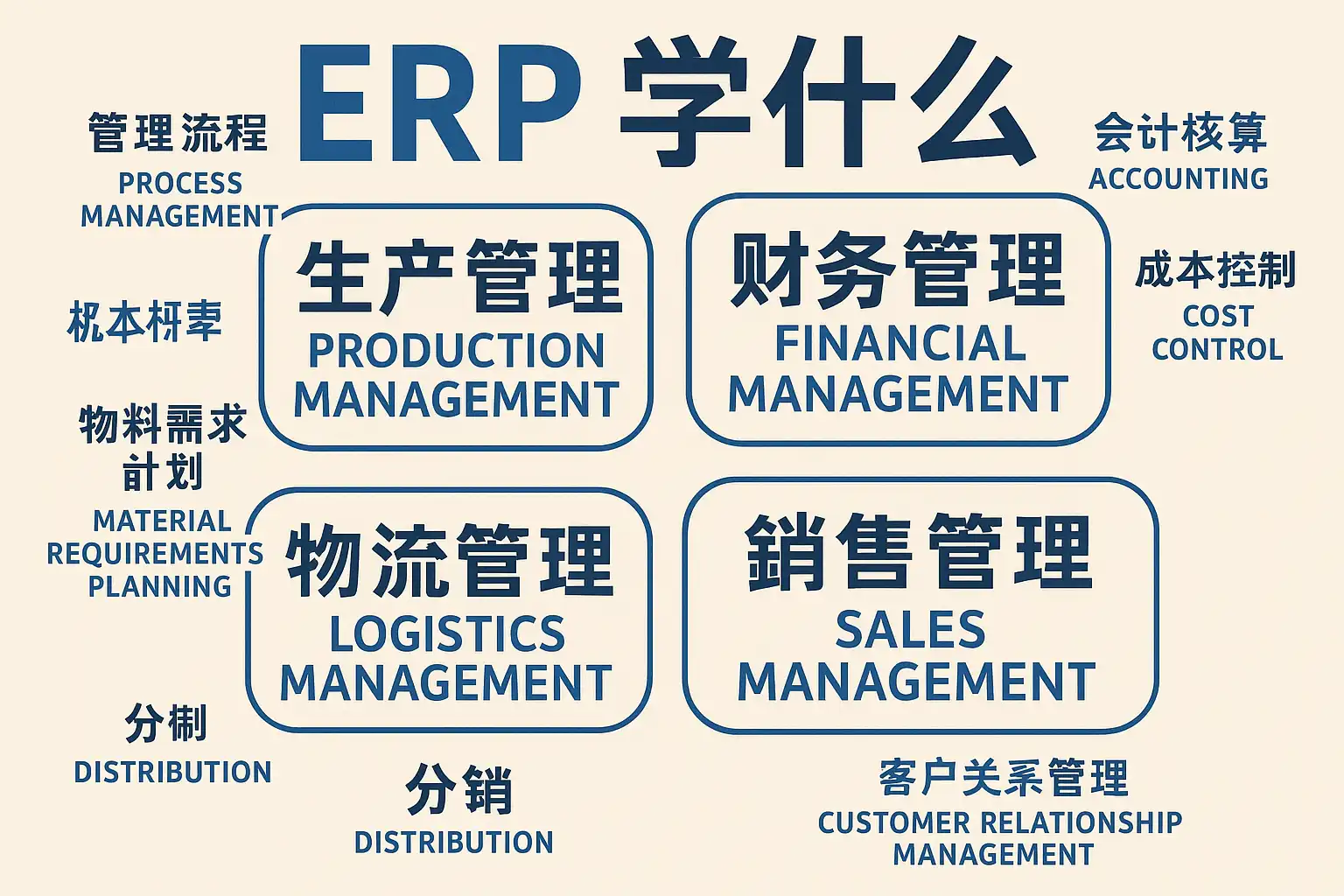 我最近听说ERP系统在企业管理中很重要,但我不太清楚具体要学习哪些内容。学习ERP到底包括哪些方面?