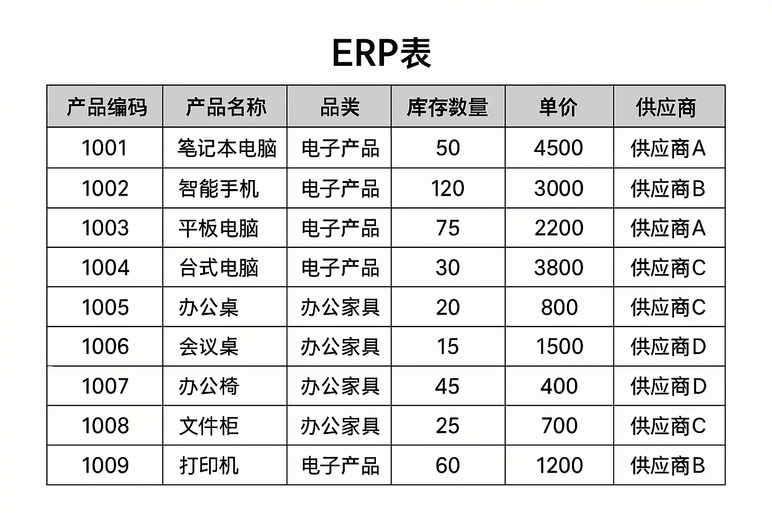 ERP表是企业资源计划(Enterprise Resource Planning, ERP)系统中用于存储和管理业务数据的结构化数据表。它们负责记录企业各个模块(如财务、采购、库存等)的关键信息。例如,销售订单表保存所有客户订单信息,通过这些ERP表,系统能够实现数据的统一管理和流程自动化。