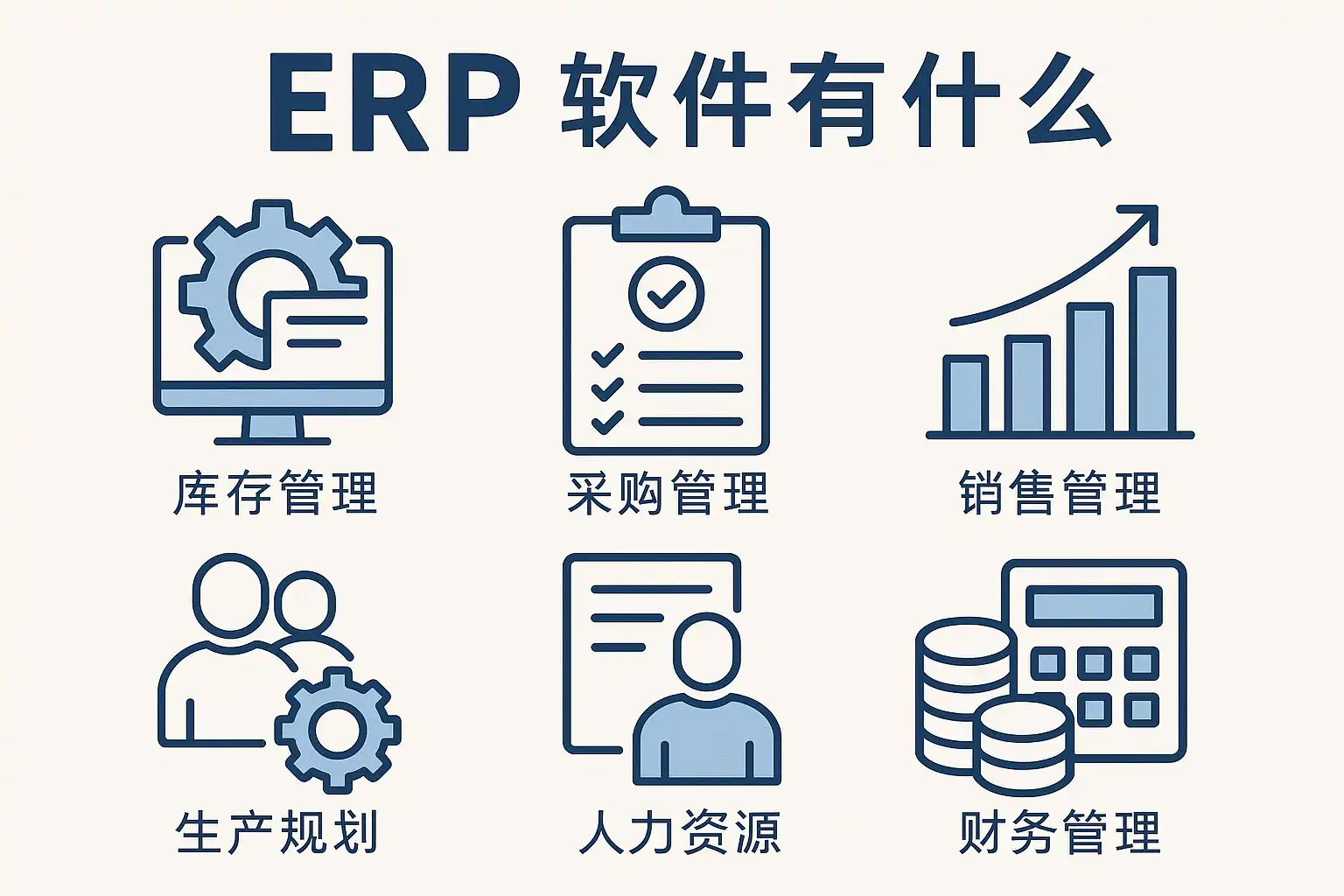 ERP软件的核心功能主要包括财务管理、供应链管理、生产计划、人力资源管理和客户关系管理(CRM)。