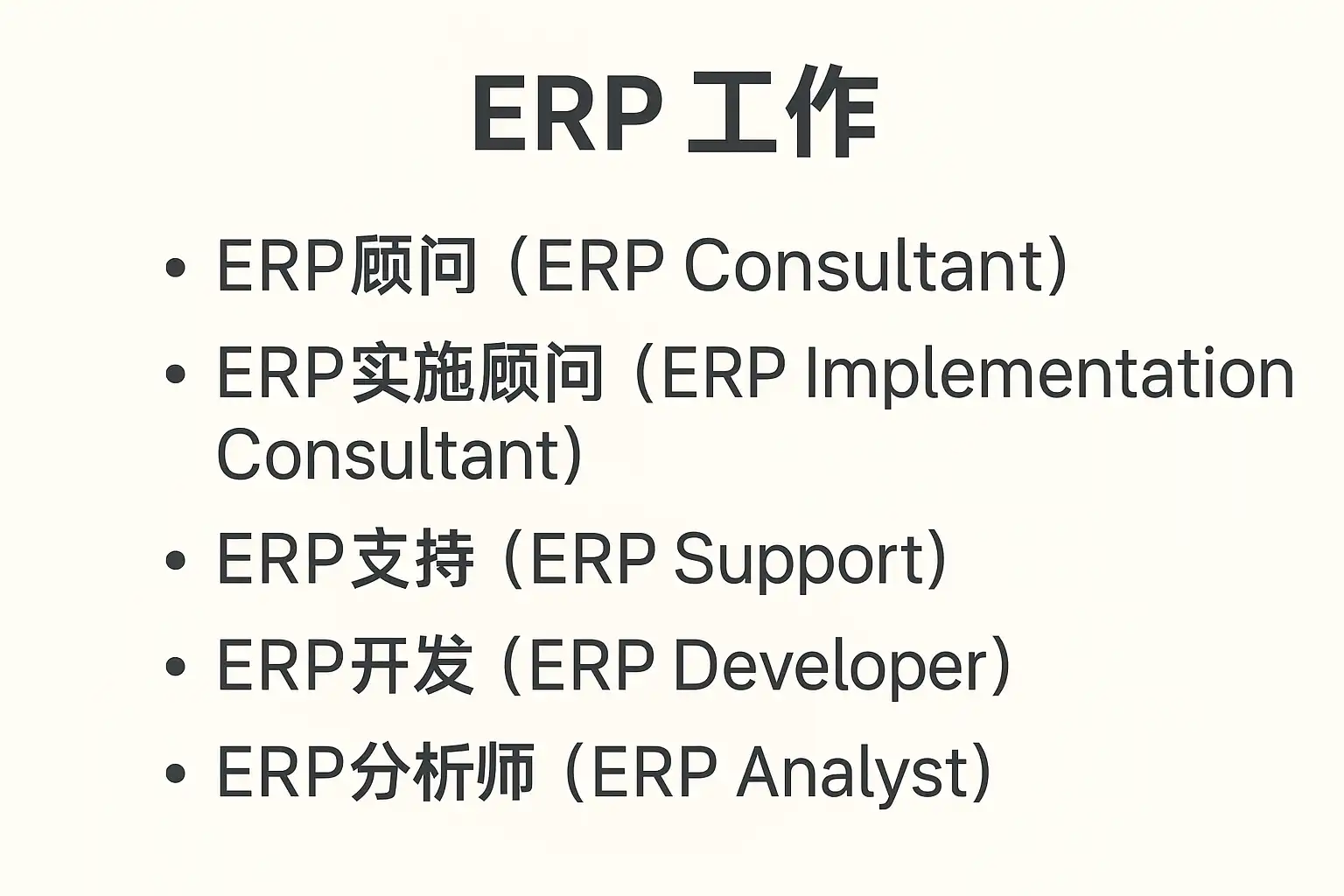 ERP(企业资源计划)系统涵盖多个模块,如财务、供应链、生产制造等。学习ERP后,常见的就业岗位包括: