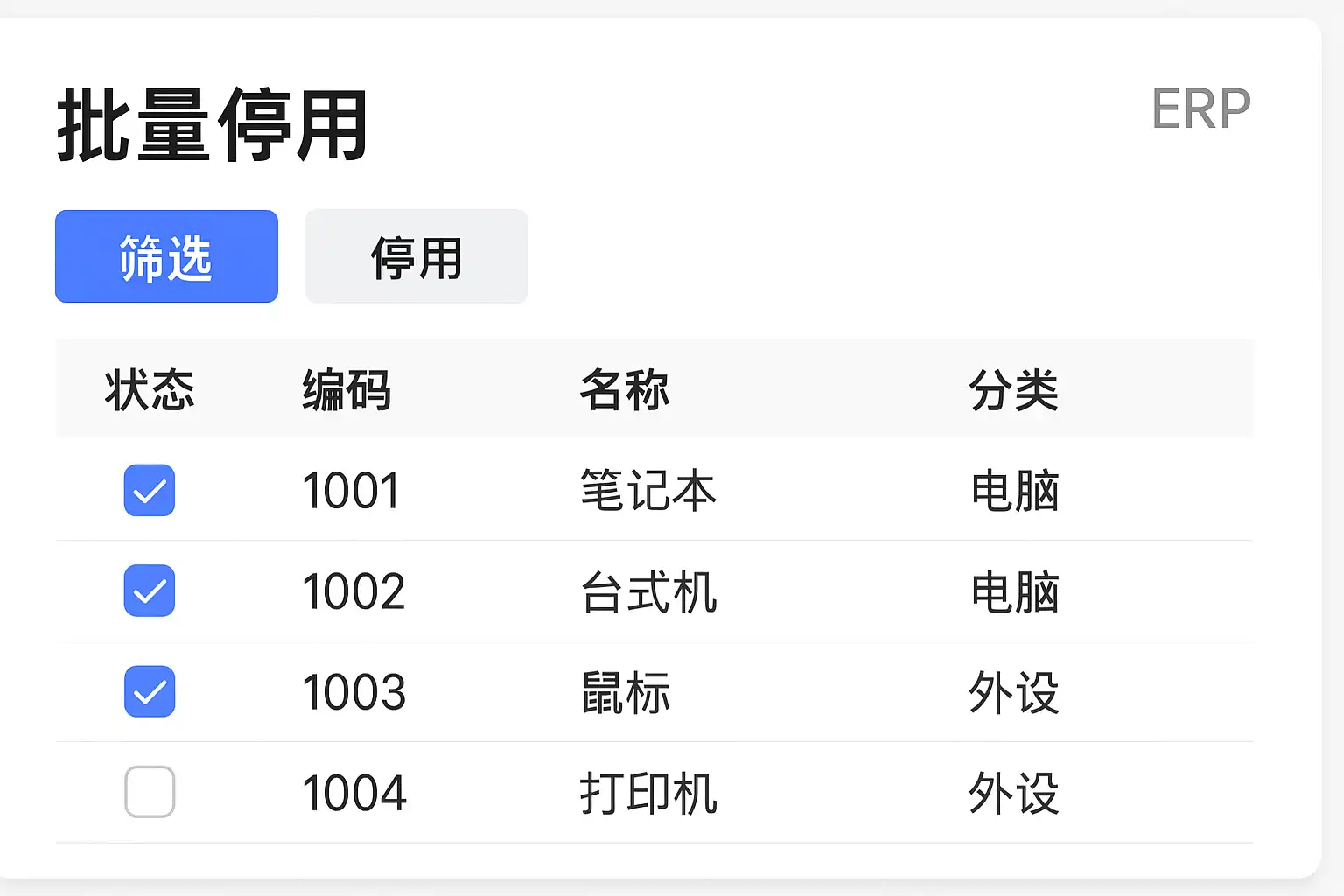 ERP系统批量停用功能支持哪些条件筛选?