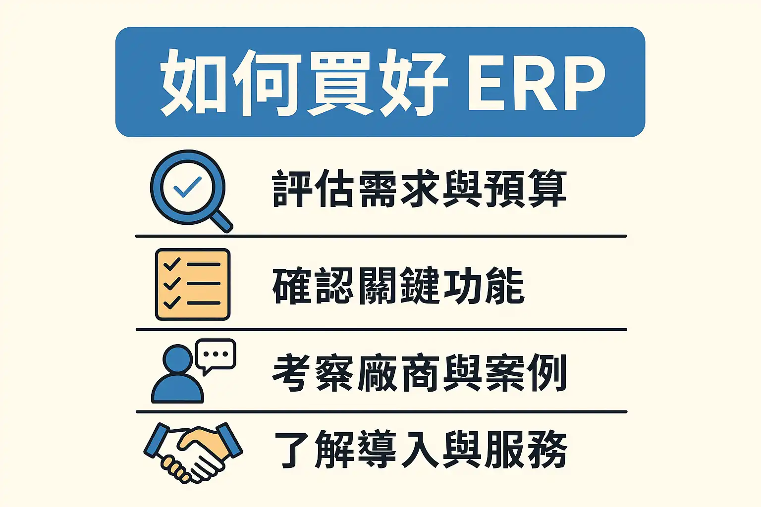 综上所述,要买好合适自己的ERP系统,请务必按如下步骤行动: