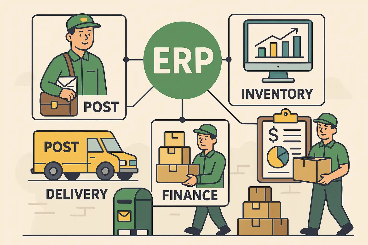ERP(企业资源计划)系统帮助邮政企业整合分散的信息流、物流及资金流,实现从邮件揽收到配送全流程的统一管理。主要价值体现在: