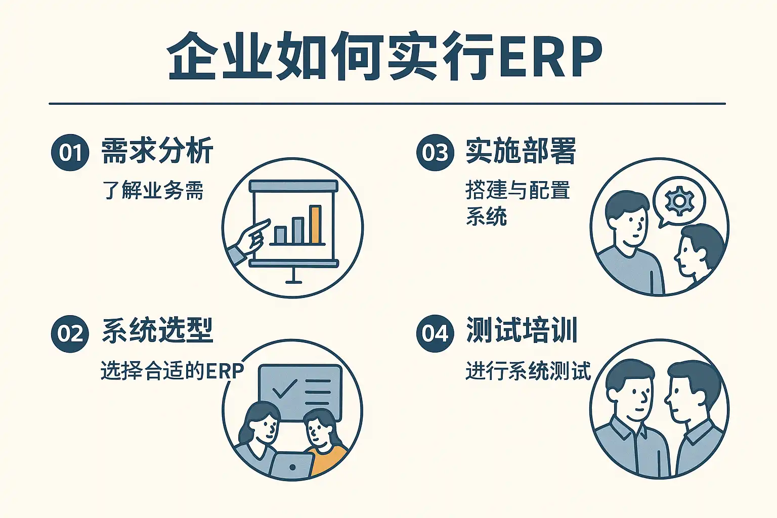 综上所述,企业实行ERP需要经历“目标梳理—选型—实施—培训—优化”五大环节,每一步都不可忽视。其中,“明确目标”和“选好平台”是成败关键。建议如下: