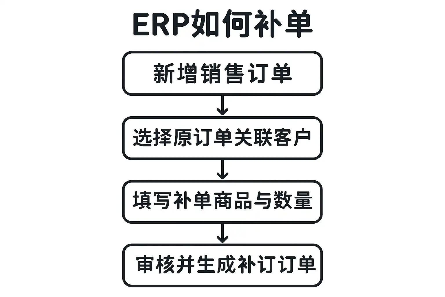 ERP补单是指在系统中补录因遗漏或其他原因未及时录入的订单。一般流程包括: