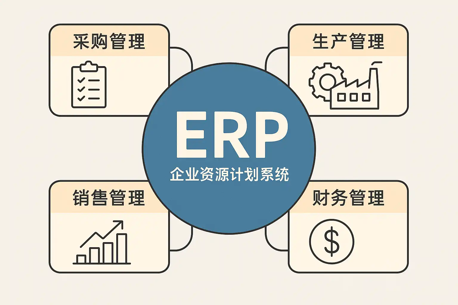 - ERP(Enterprise Resource Planning,企业资源计划)是一套将企业生产、供应链、财务、人力资源等各类核心业务流程进行集成管理的信息系统。