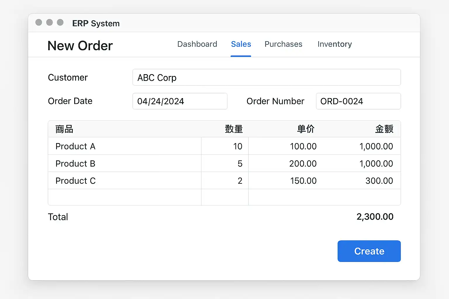 | 1. 新建订单 | 在ERP系统内选择“新建销售/采购/生产订单”,填写基本信息。 |