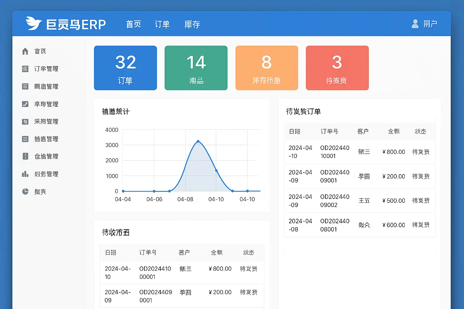 巨灵鸟ERP系统核心功能涵盖:
