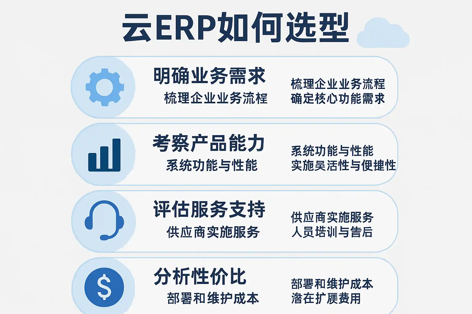 在选择云ERP系统前,企业应从自身实际出发,细致梳理业务流程、管理短板及未来发展方向。核心需求包括但不限于以下几个方面: