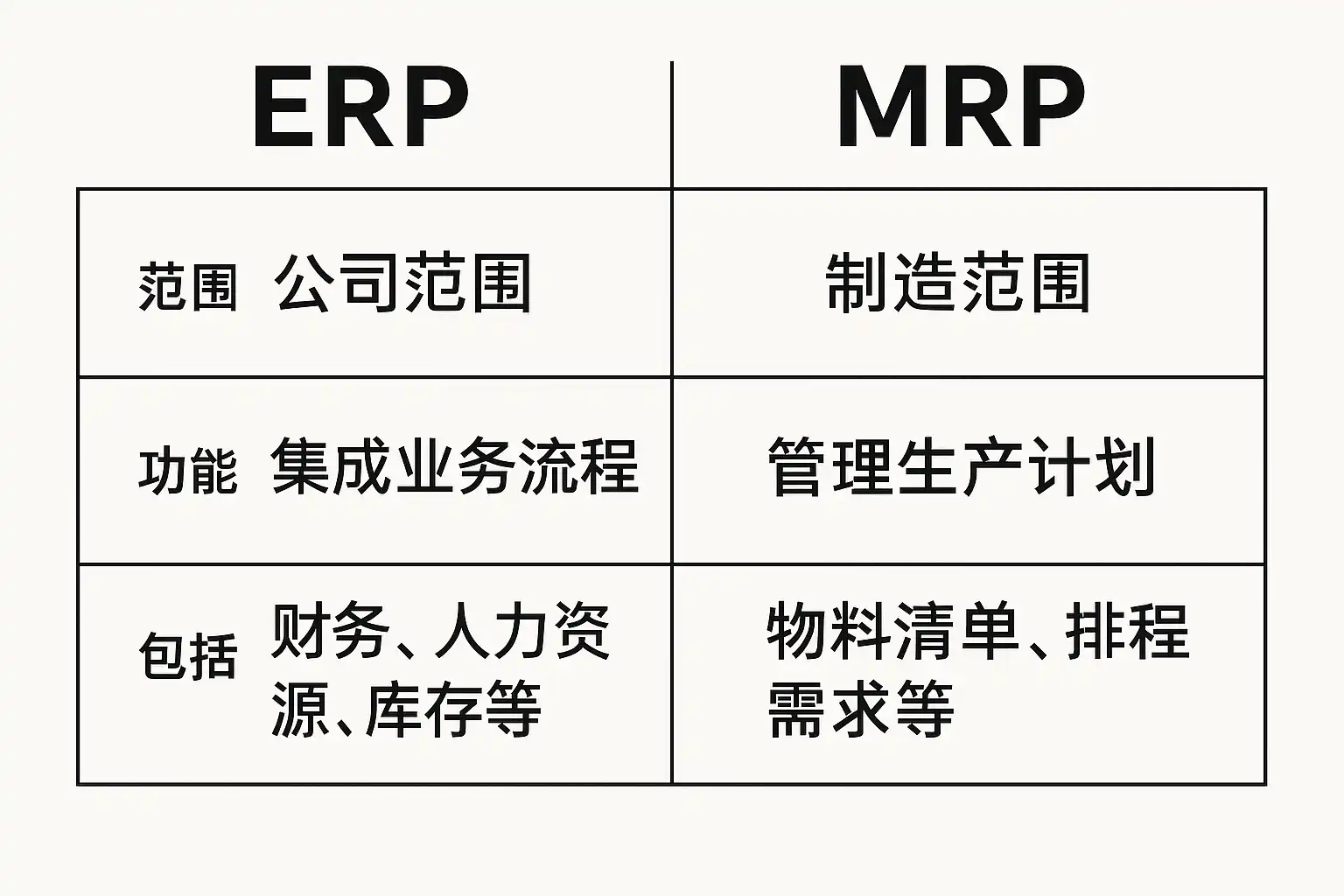 | 功能模块 | ERP系统覆盖范围 | MRP系统聚焦范围 |