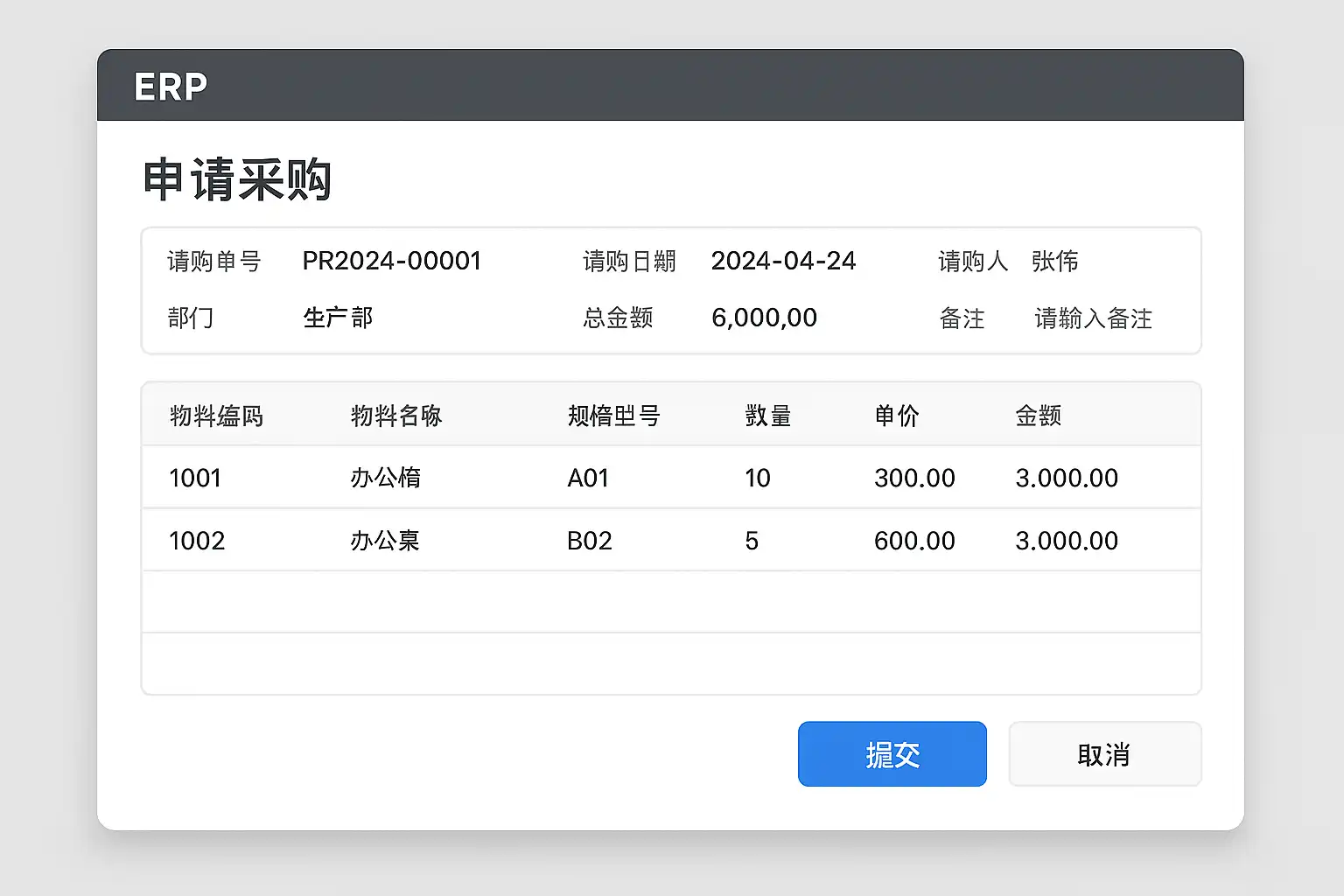 - 创建采购申请单,填写物料名称、数量及预算;