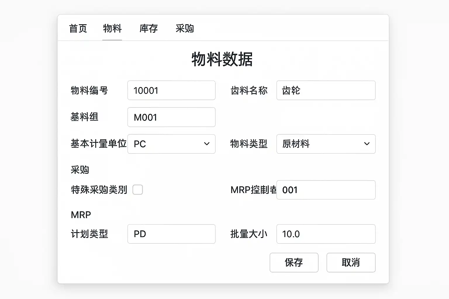 - 物料主数据录入:填写物料编码、名称、规格等基础信息。