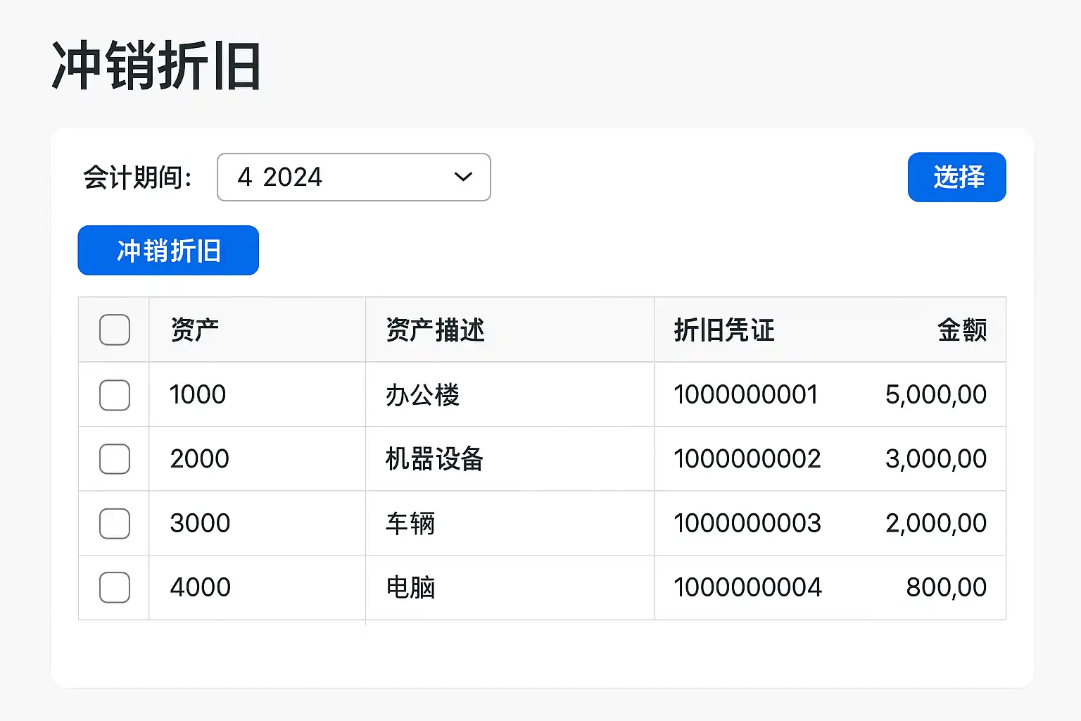 - 审批通过后,由系统自动生成借记“累计折旧”、贷记“管理费用”的凭证,同步到本期总账;