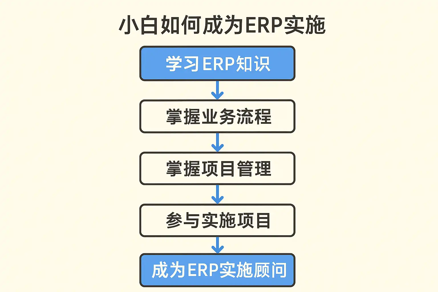 总结来看,小白想要成为一名合格的 ERP 实施人员,应遵循以下路径: