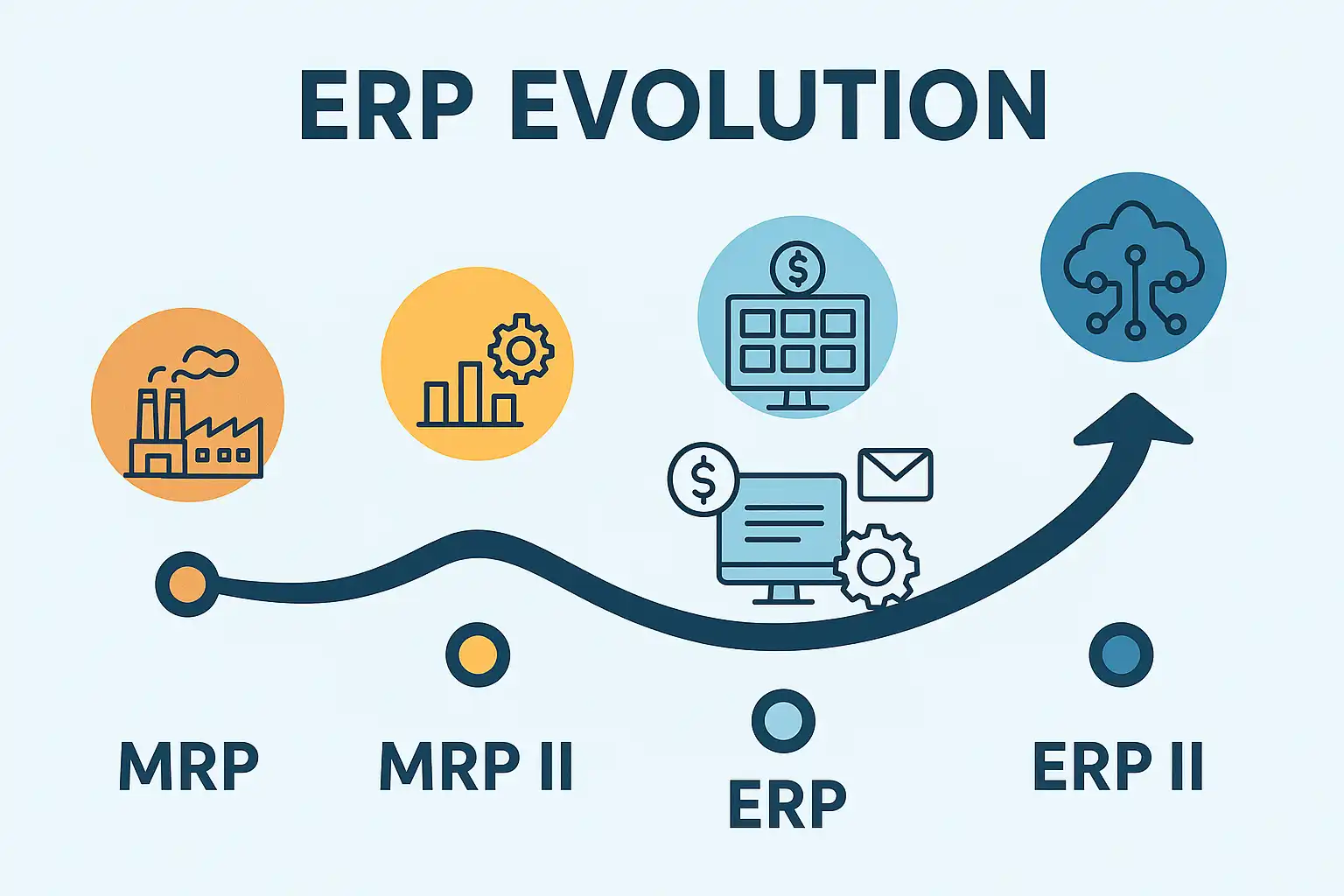 MRP是最早期专注于解决“缺货”与“积压”难题的信息系统。随着业务需求扩大,MRP II引入了车间管理、人力资源等模块。90年代起,ERP理念兴起,实现了财务、人事、采购、销售乃至客户关系等模块的一体化。21世纪后,云计算和AI推动ERP向更高层次进化。