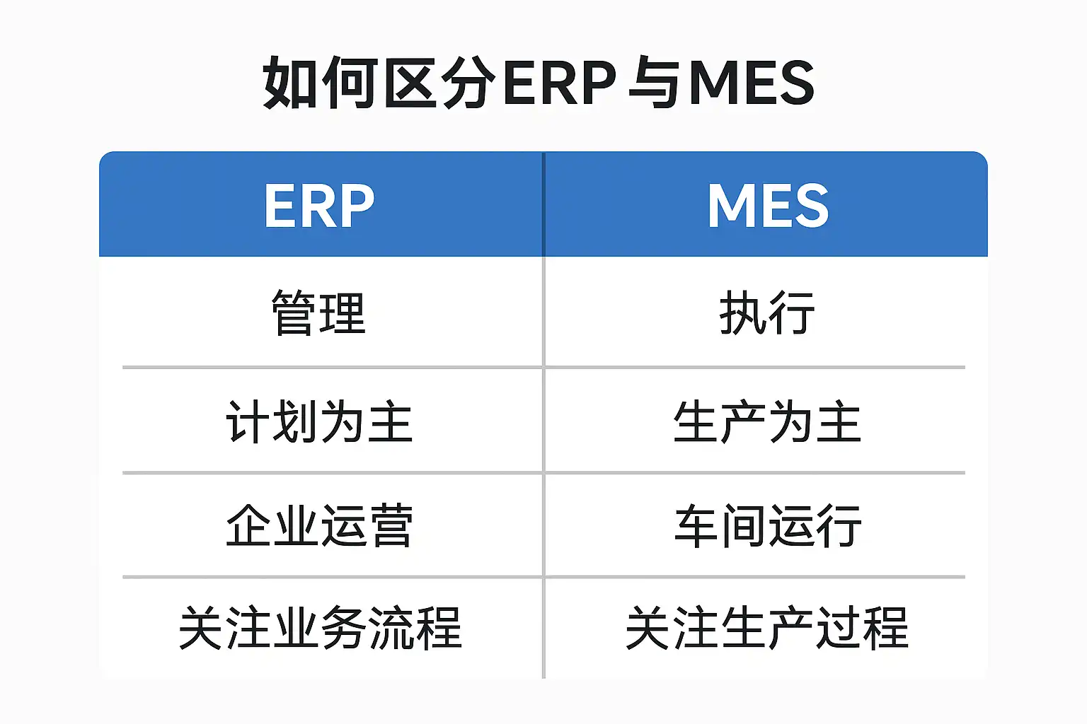 | 功能定位 | 战略/战术决策支持,侧重流程优化 | 车间操作执行,侧重生产过程控制 |