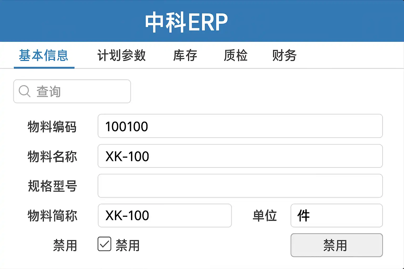 案例说明:某企业曾误删关键零件信息,导致财务审核时无法核对生产成本,最终不得不恢复备份。因此,中科ERP推荐通过‘禁用’功能安全管理闲置或停产的物料。