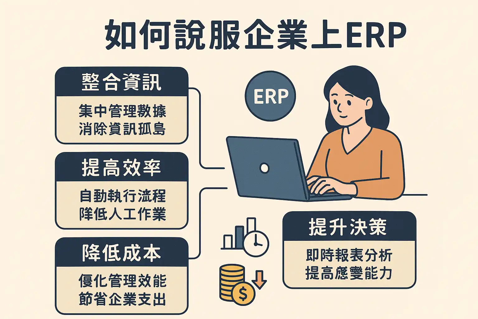 - 明确价值——用数据展示ERP带来的具体好处,比如减少重复劳动30%。