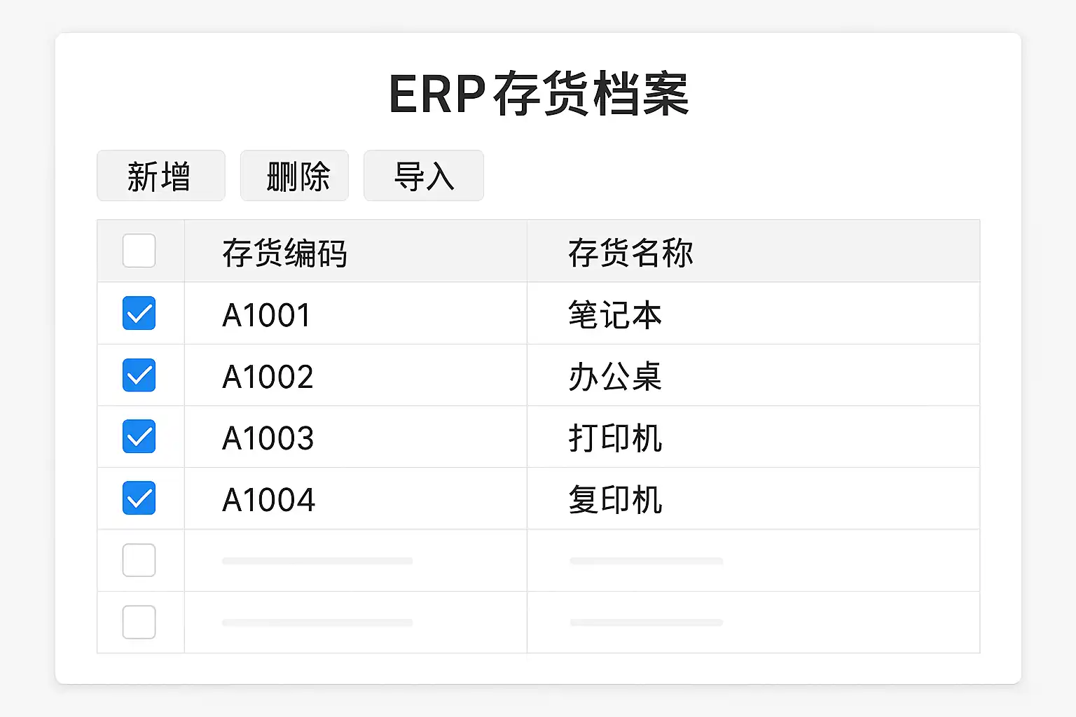 - 在【存货档案】主列表页面,每行左侧设有复选框。