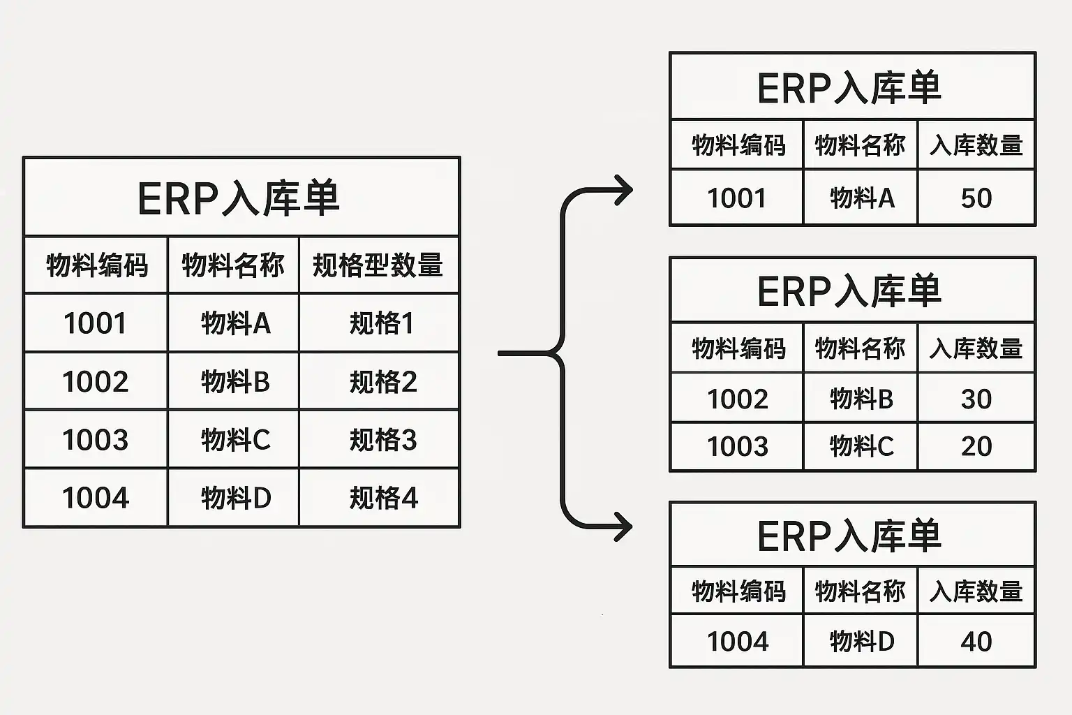 ERP(Enterprise Resource Planning)系统中的“入库单”通常是指物资或商品进入企业仓库时,由采购部门或仓储人员录入的信息记录。由于采购订单往往涉及多个品类、供应商或到货批次,在实际业务执行过程中,经常需要将一张包含大量明细条目的原始入库单,按需“拆分”为若干子单据,以便于后续上架管理、质检验收及财务对账等操作。