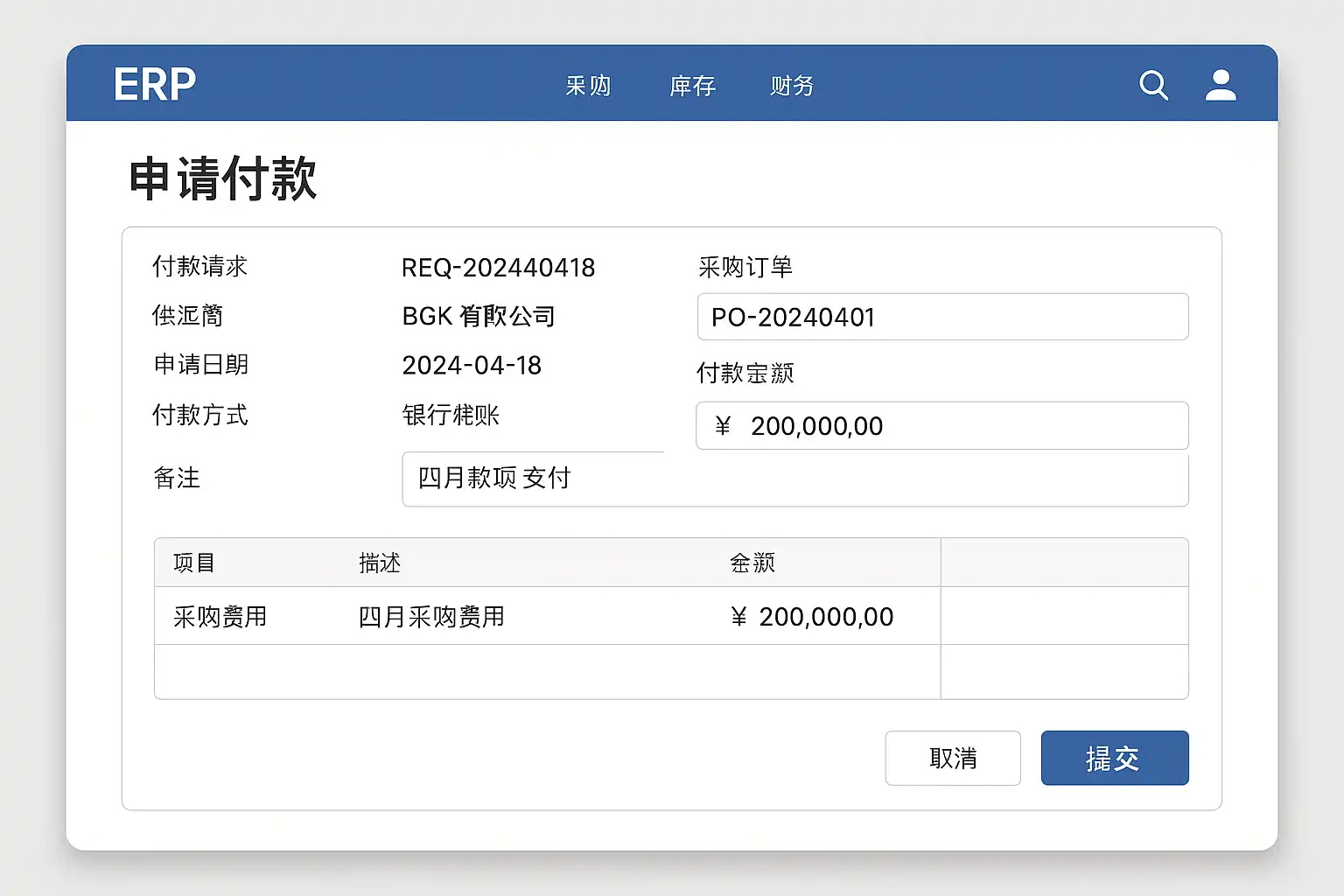 - 创建付款申请单:填写供应商信息、金额及付款理由。