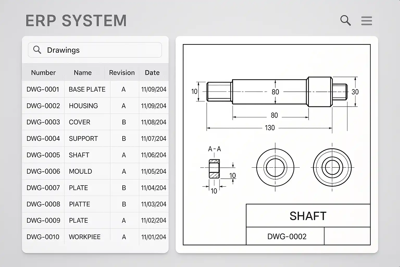 | CAD附件 | 使用计算机辅助设计软件生成的电子格式工程图 | ERP中的CAD附件通常为.DWG或.DXF格式,可在线预览 |