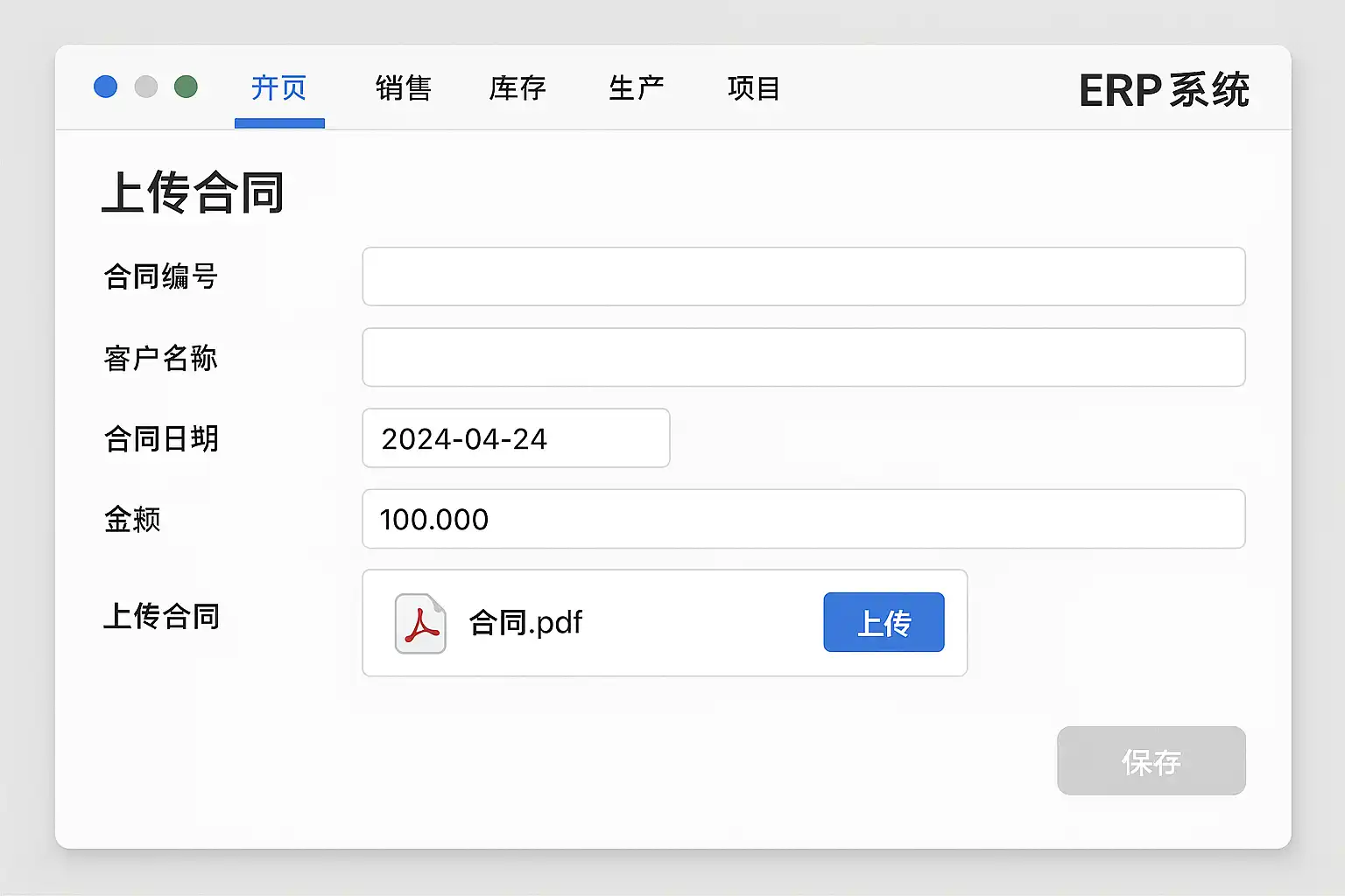 - 直接上传附件:通过ERP界面中的附件模块上传文档,支持PDF、Word、Excel等格式。