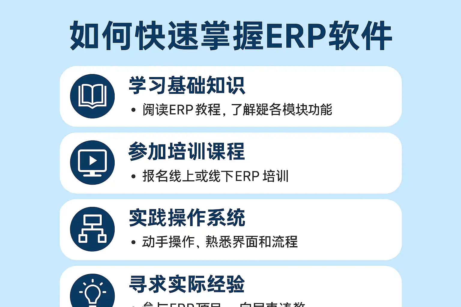 快速掌握ERP软件需要有条理地推进——先打牢基本功,再通过大量实操加深理解,并善于利用外部优质资源辅助成长。在整个过程中,要特别关注结合自身工作场景灵活运用,而非死记硬背。同时,鼓励团队内经验交流,共同提高信息系统水平,这样才能真正把数字化工具转变为提质增效利器,为企业发展赋能。