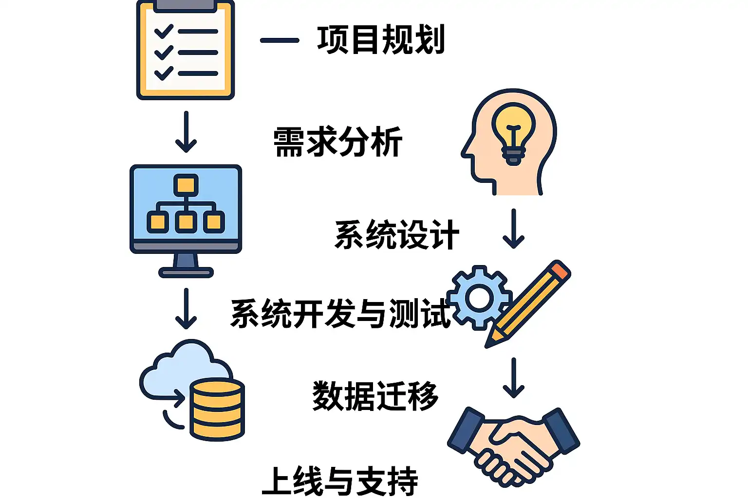 | 6. 系统部署测试 | 安装部署环境,多轮测试(单元测试、集成测试、用户验收测试) | 技术人员/终端用户 |
