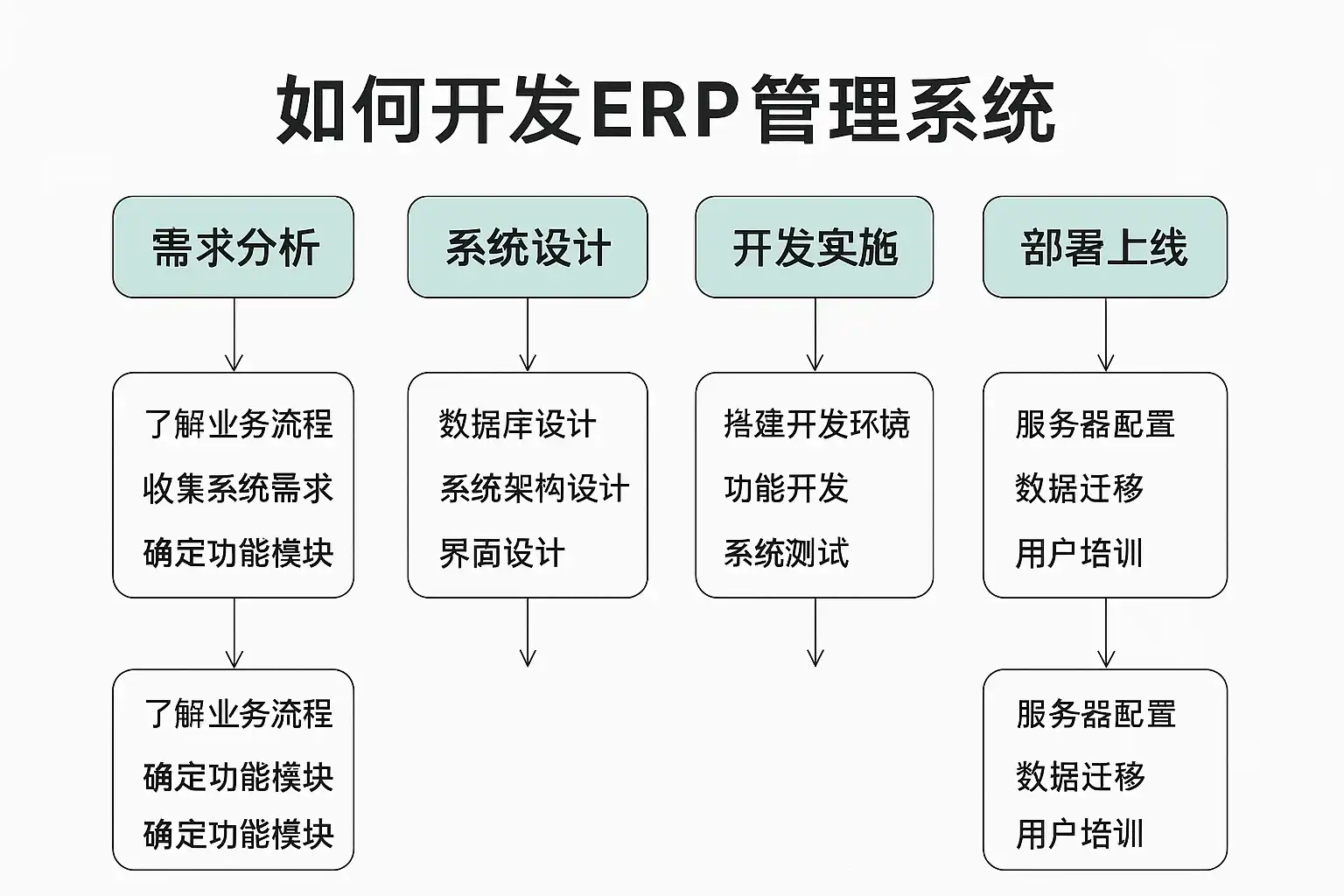 开发ERP管理系统需要1、明确企业需求,2、进行系统架构设计,3、选择合适的技术栈,4、组织高效开发团队,5、注重项目实施与后期维护等五个核心步骤。其中,“明确企业需求”是ERP系统开发的基础与关键。只有深入理解企业各部门业务流程和痛点,才能准确规划出功能模块和数据流程框架,避免后期返工和资源浪费。例如,通过与财务、人力、采购等部门的多轮沟通,可以梳理出实际业务所需的数据流转、审批逻辑以及报表需求,为后续系统架构和功能实现打下坚实基础。