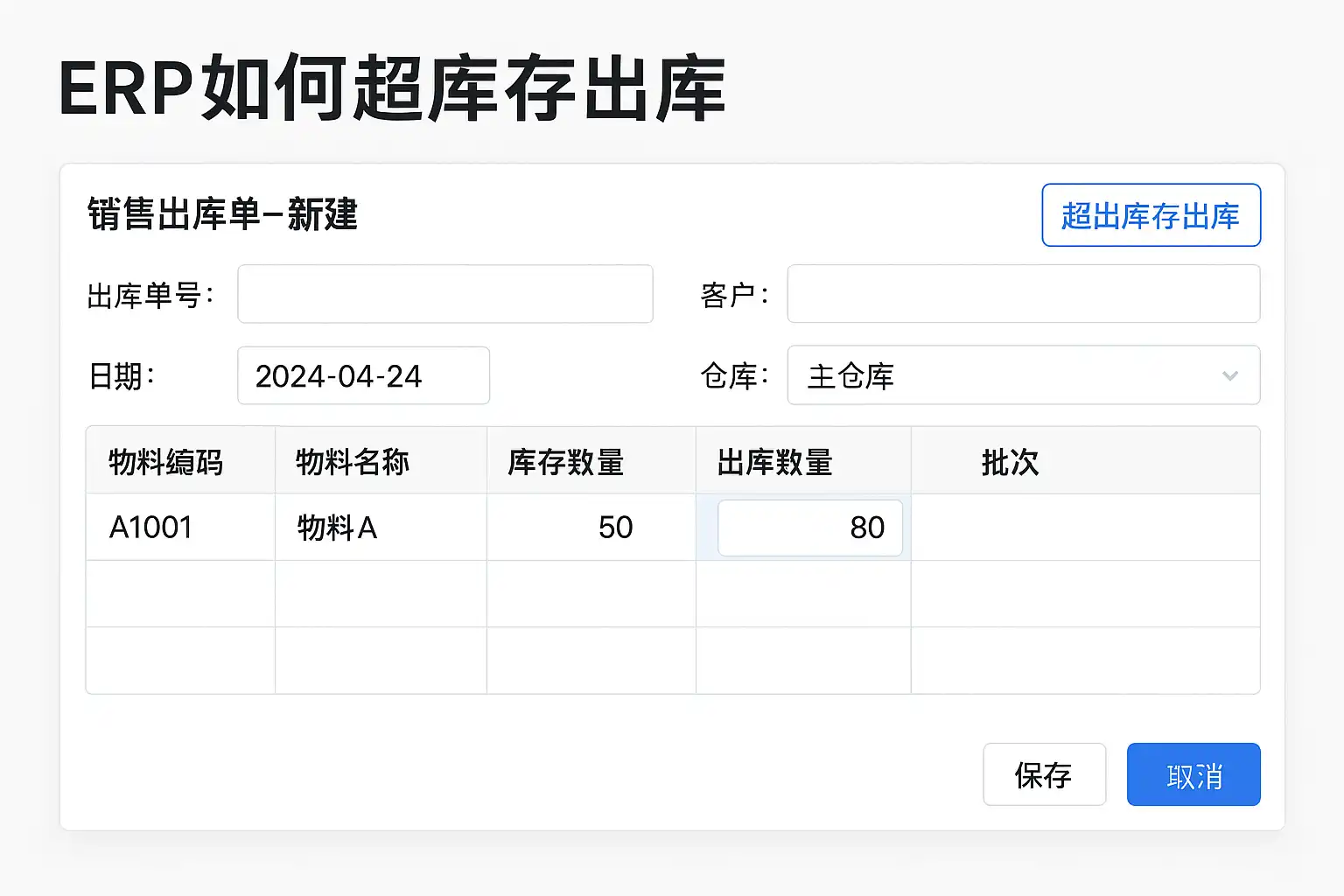 ERP系统通过配置权限和流程设置支持超库存出库。具体实现包括: