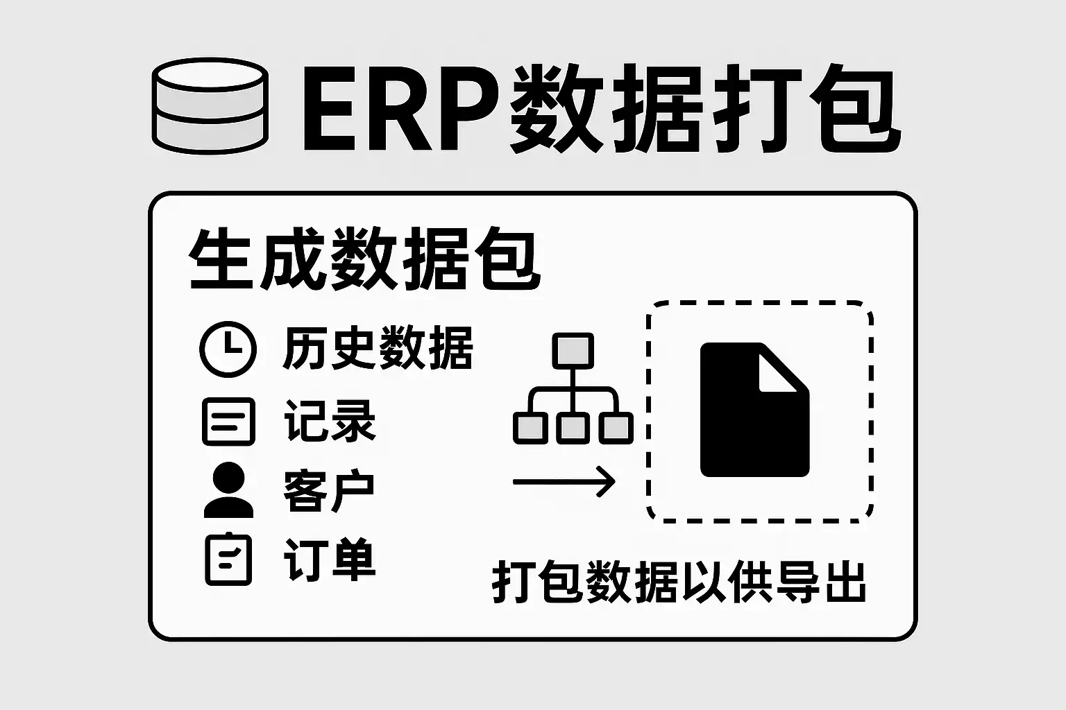 ERP系统的数据打包,指在满足业务连续性、安全性和可用性的前提下,将分散在各子模块中的信息有条理地汇总整合,并统一提取为指定的数据包文件。其典型应用场景包括: