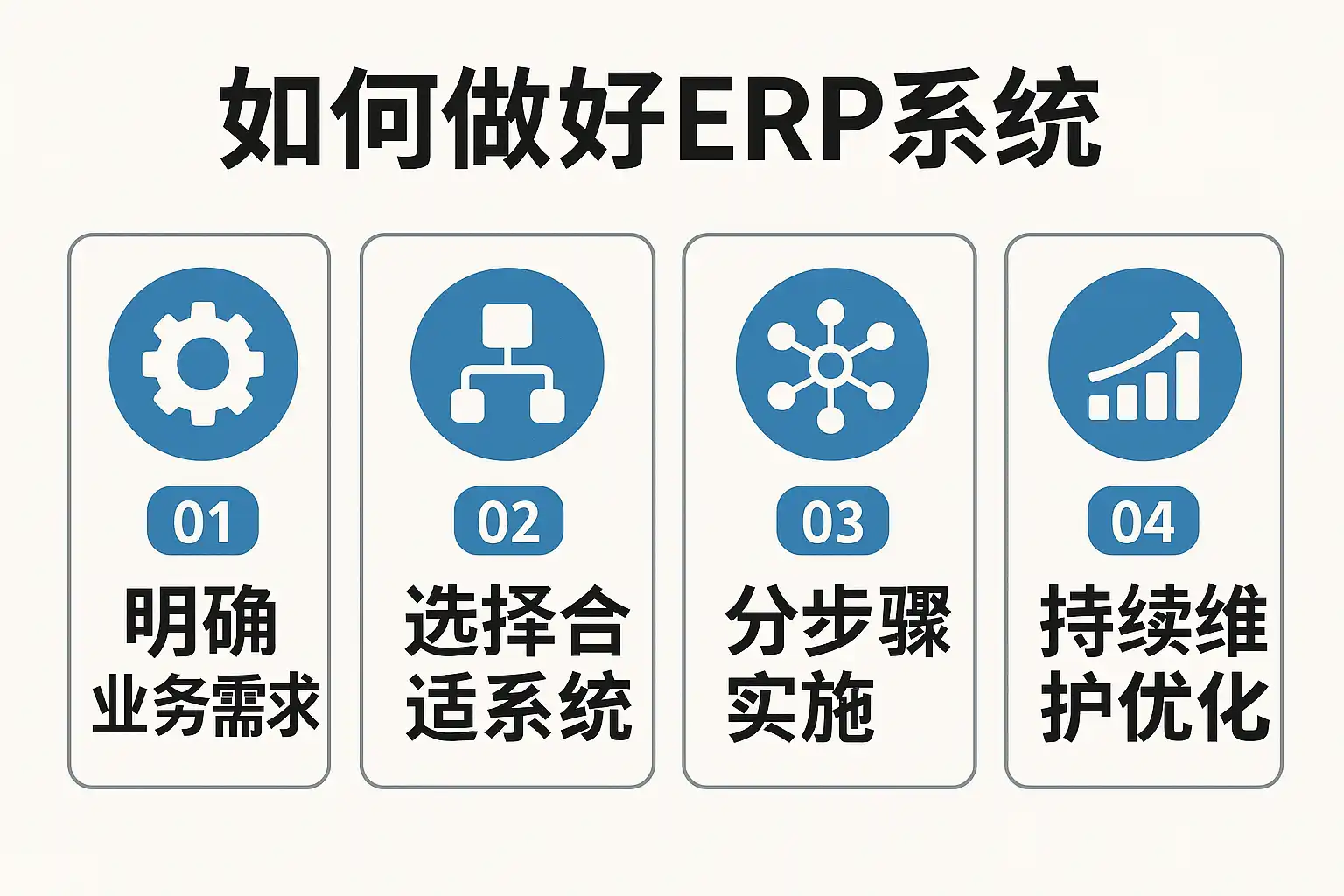 要想做好ERP系统,核心要点主要包括:1、明确企业需求与目标;2、科学选择合适的ERP平台;3、重视实施过程中的项目管理与团队协作;4、持续优化与维护系统;5、加强员工培训和变革管理。其中,“明确企业需求与目标”是整个ERP建设的基础。只有深入分析企业各部门的实际业务流程和痛点,梳理清楚信息化需求,才能在后续环节有针对性地选择和构建符合自身特点的ERP方案,从而实现资源整合与效能提升。例如,在简道云ERP系统实施前,许多企业会组织调研小组,与各业务部门沟通,归纳日常管理难点,并制定量化目标,这不仅避免了系统上线后功能脱节,还大幅提升了最终应用效果。