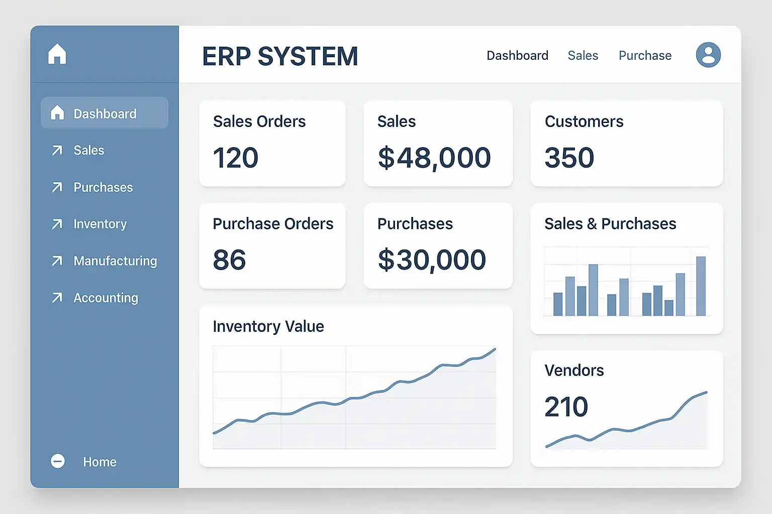 - 快捷菜单:快速访问常用模块,如采购、库存、销售等。