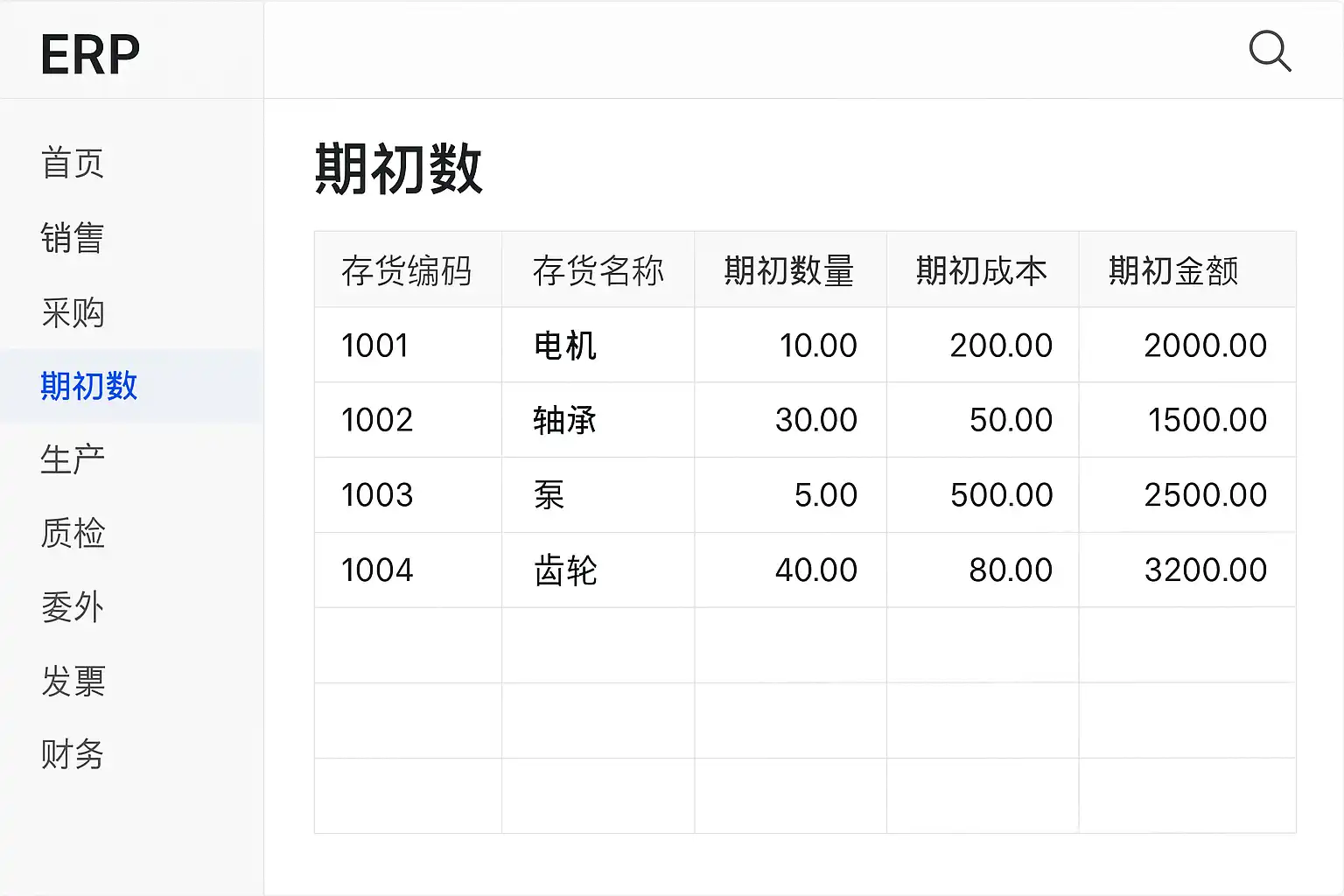 | 库存管理 | 库存管理 → 期初设置/库存期初 | 查看/编辑各商品仓库数量与金额 |