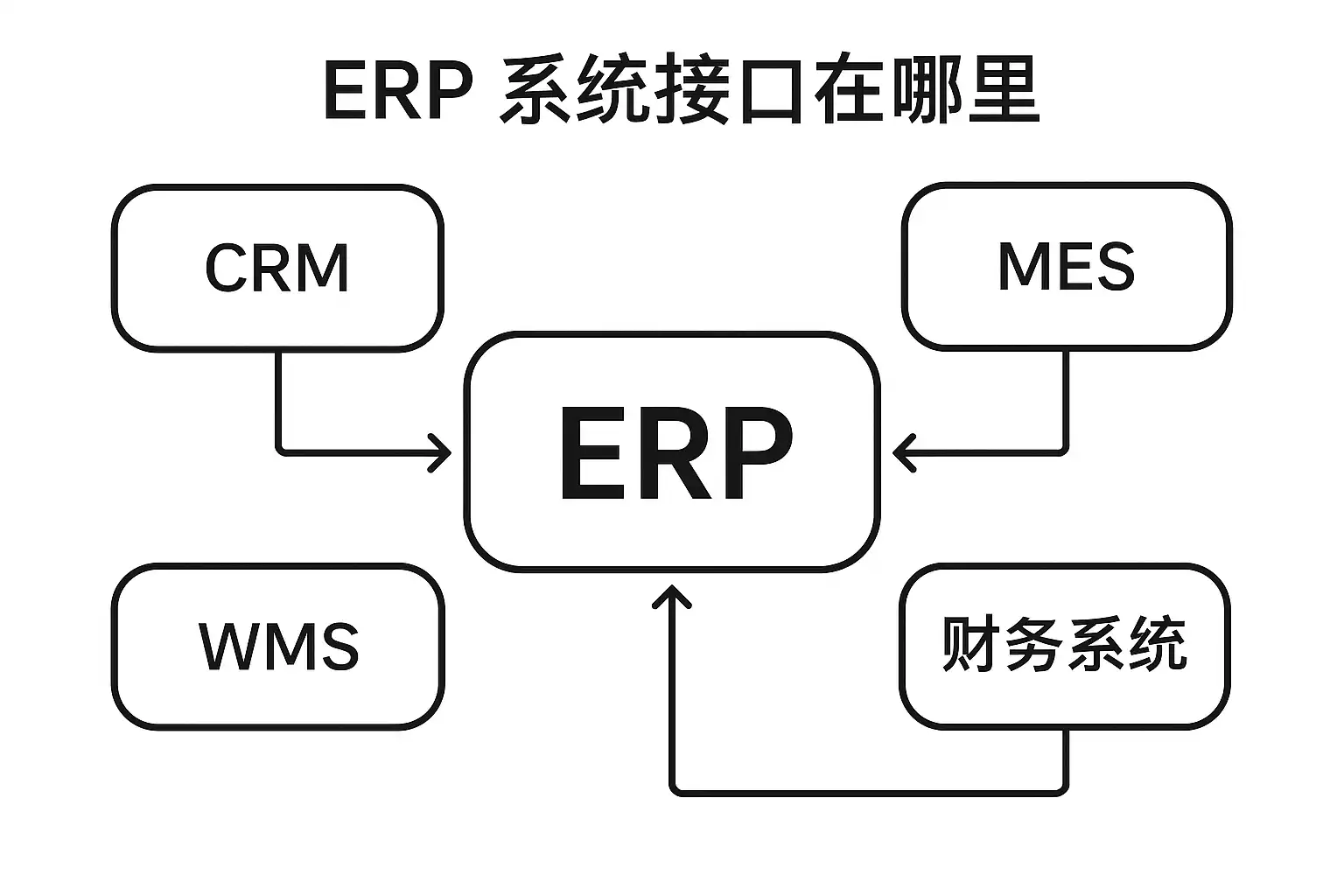 不同品牌和部署模式的ERP系统,其接口位置有所差异,但主流平台(如SAP、Oracle、用友、金蝶及简道云ERP)大致包含以下几种类型: