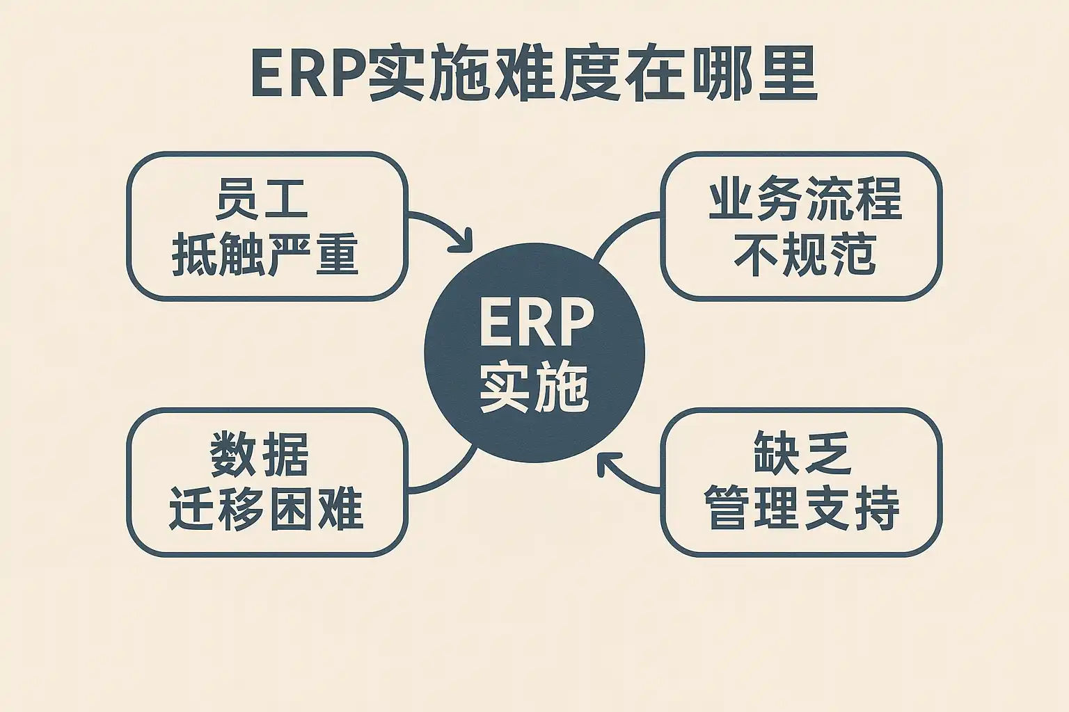 在ERP项目推进过程中,不同类型企业会遇到各具特色的挑战,但以下四大难点具有普遍性: