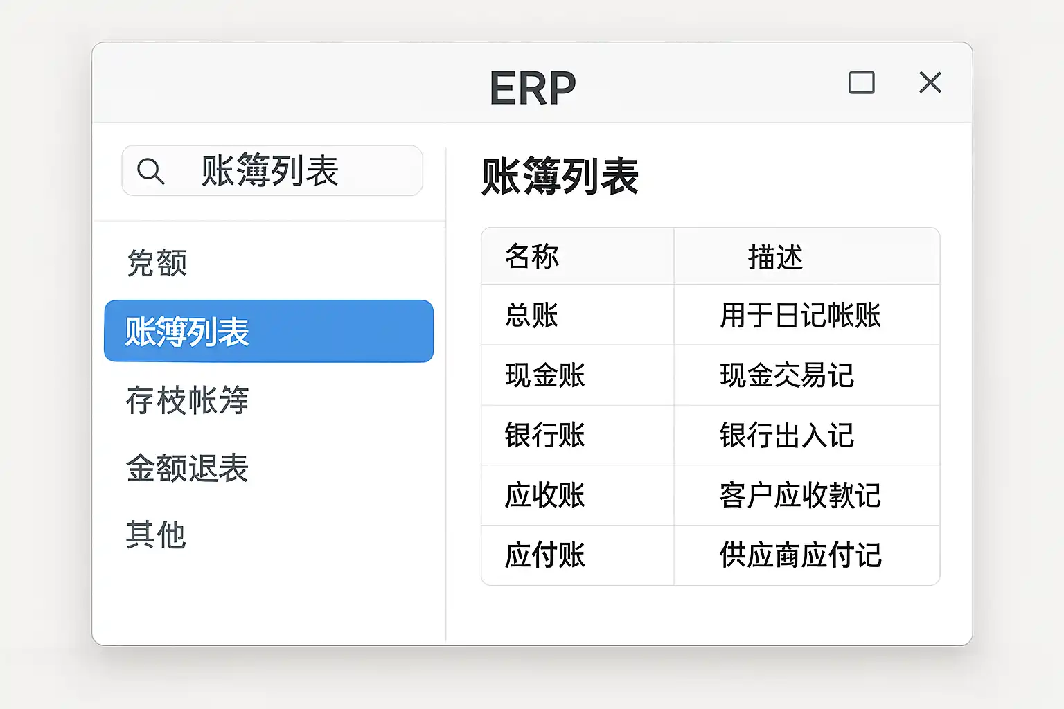 - ERP中的账簿列表指的是企业所有会计科目下各类明细账户的集合,是企业进行会计核算、凭证查询和数据统计的基础。