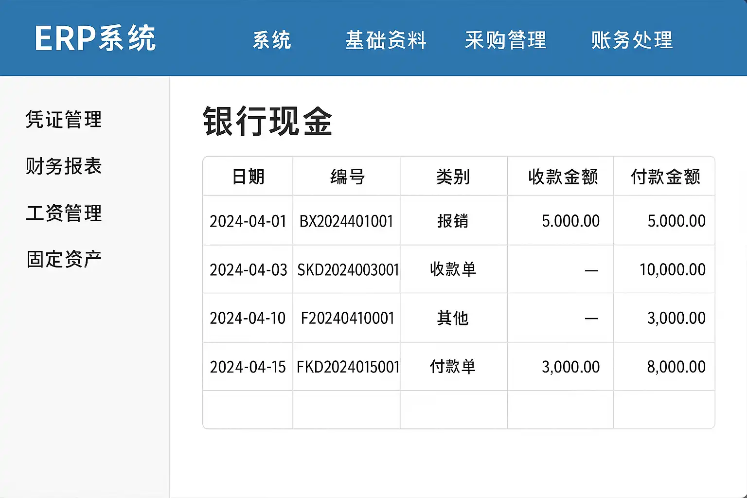 假设某制造业公司拥有4个不同开户行的基本户和结算户,每天涉及大量采购付款和销售回款。使用简道云ERP后,可实现如下优化流程: