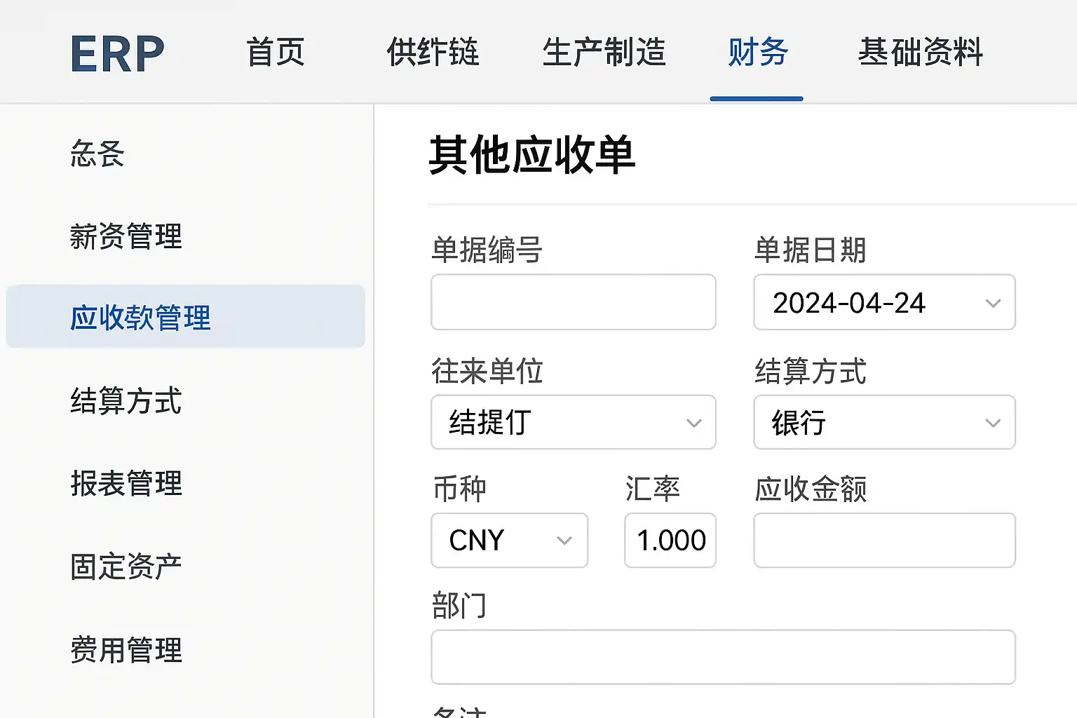 在ERP系统里,‘其他应收单’通常归类于财务管理模块,具体路径一般为:【财务管理】→【应收管理】→【其他应收单】。不同ERP厂商界面可能略有差异,但主流ERP如用友、金蝶都遵循类似结构。通过该模块可以方便地录入、查询和管理非主营业务产生的应收款项。