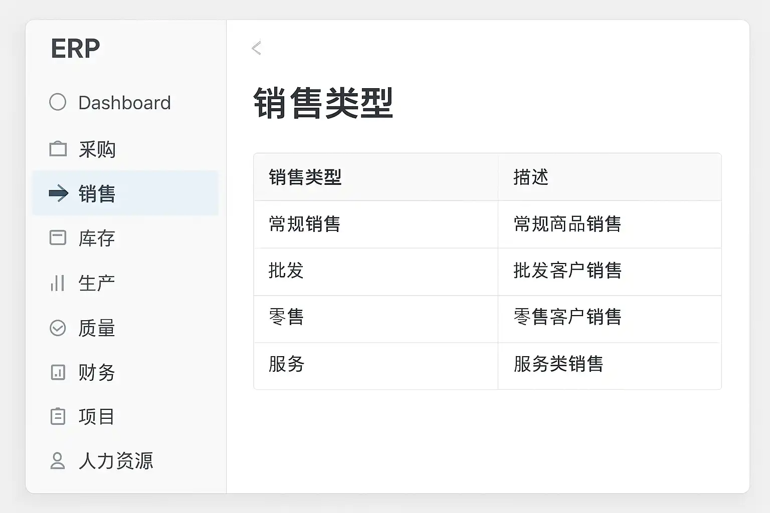 在 ERP(Enterprise Resource Planning,企业资源计划)系统中,“销售类型”是指对销售业务进行细分与归类的方式。不同的行业或企业规模对“销售类型”的定义有所差异,但其核心目的是实现对各类销售活动的有效区分与管理。常见的销售类型包括但不限于:批发、零售、电商直销、分销代理、大客户专供等。