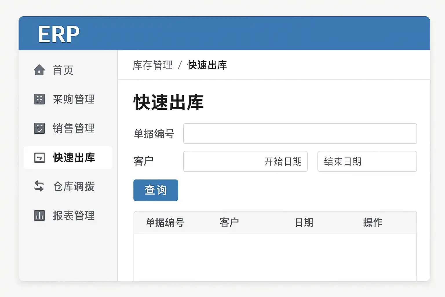 在大多数ERP系统中,快速出库功能通常位于“仓库管理”或“库存管理”模块下。用户可以在主菜单中找到“出库管理”或“销售出库”选项,进入后选择“快速出库”子菜单。例如: