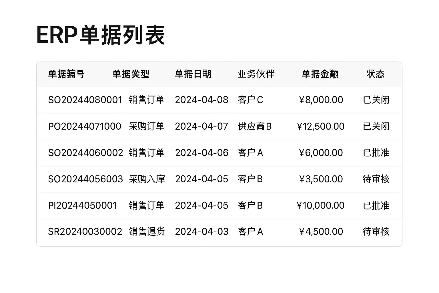 “ERP单据”包括采购订单、销售订单、库存调拨单、入库/出库单等业务凭证,是企业运营过程中关键的数据记录。所谓“单据列表”,指的是所有已录入系统的相关业务凭证集合展现页面。它支持用户按需查看、检索和管理这些业务数据。