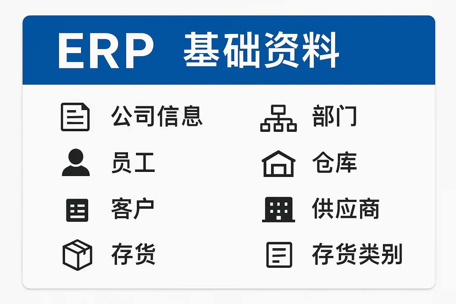 这些数据构成了整个ERP系统正常运转的数据基础,是采购、销售、库存、财务等各业务模块协同工作的前提。