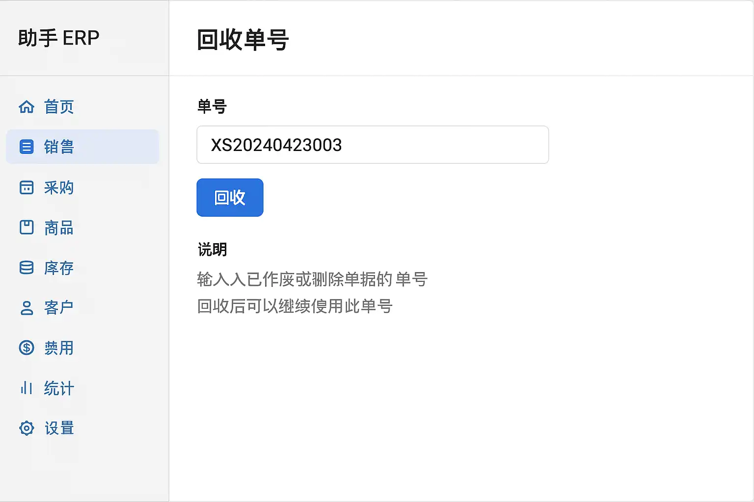 我在使用助手ERP时,发现有时候单号用完了或者需要重新利用,我想知道助手ERP具体在哪里可以回收和管理这些单号?回收单号的流程是怎样的?