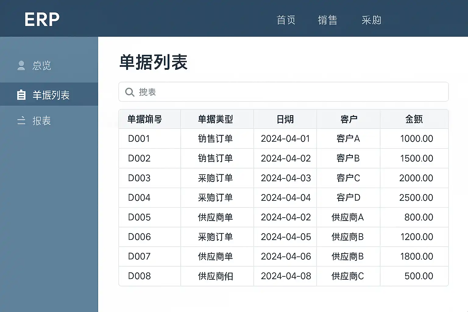ERP(Enterprise Resource Planning)系统将企业各类业务数据进行统一管理,而“单据”作为各项业务(如采购、销售、库存等)的核心记录,其管理尤为重要。绝大多数主流ERP系统都将“单据列表”集中在易于访问的位置: