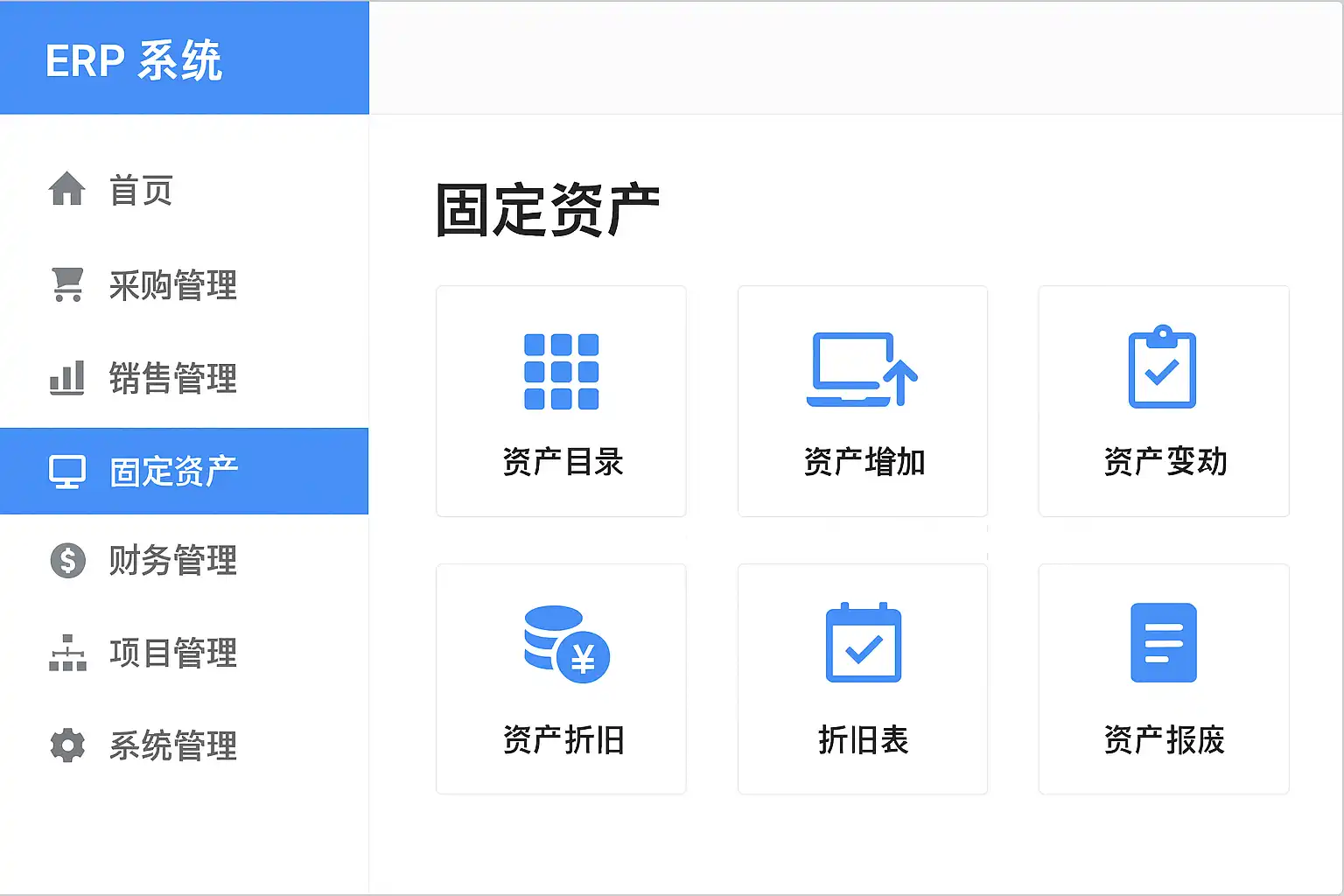 ERP系统中,固定资产模块一般位于“资产管理”或“财务管理”主菜单下。具体路径因系统不同略有差异,例如: